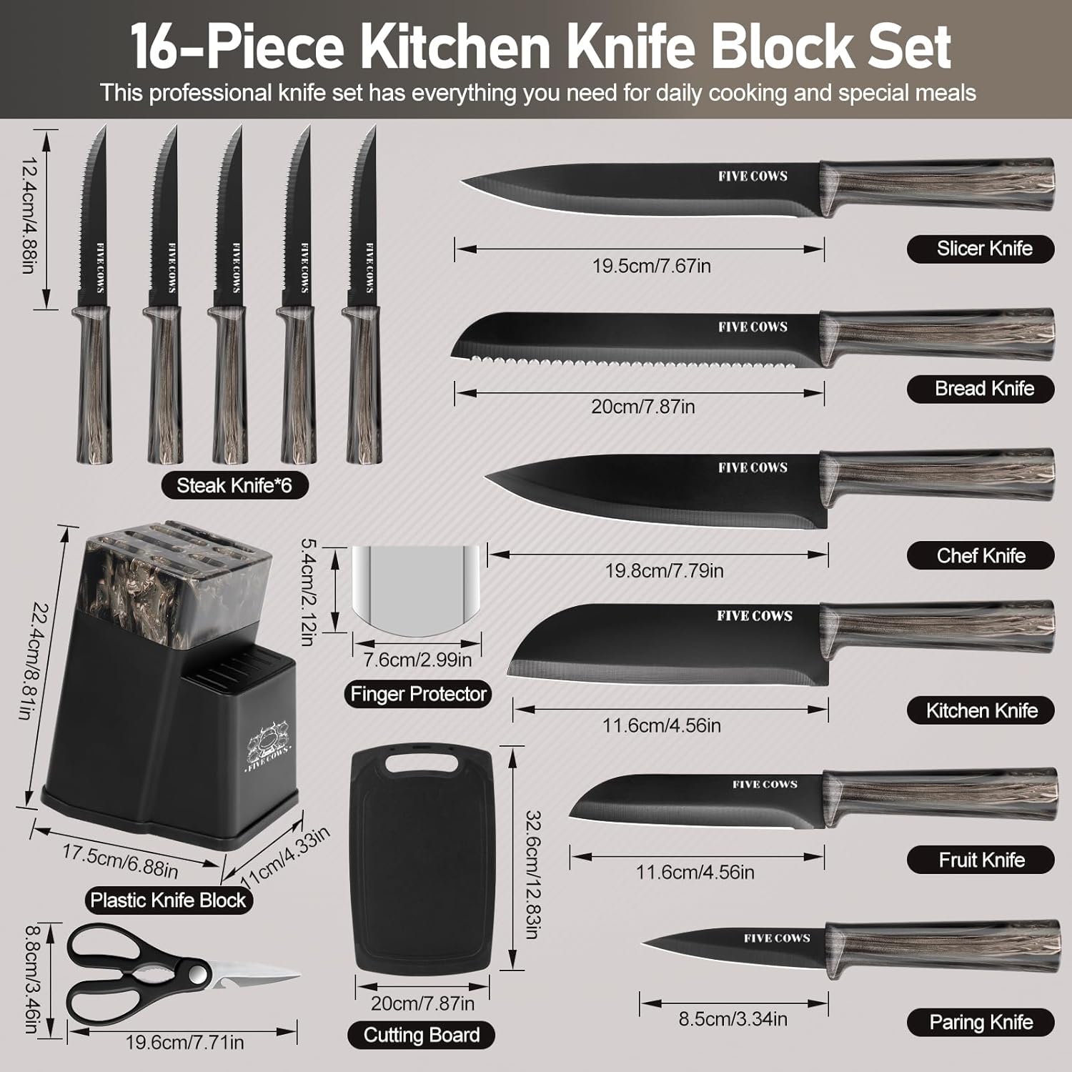 | Included Components | 8" chef knife, 8" slicing knife, 7" santoku knife, 8" serrated bread knife, 5" utility knife, 4.5" paring knife, 3" peeling knife, 4-piece 4.5" serrated steak knife set, knife blok |