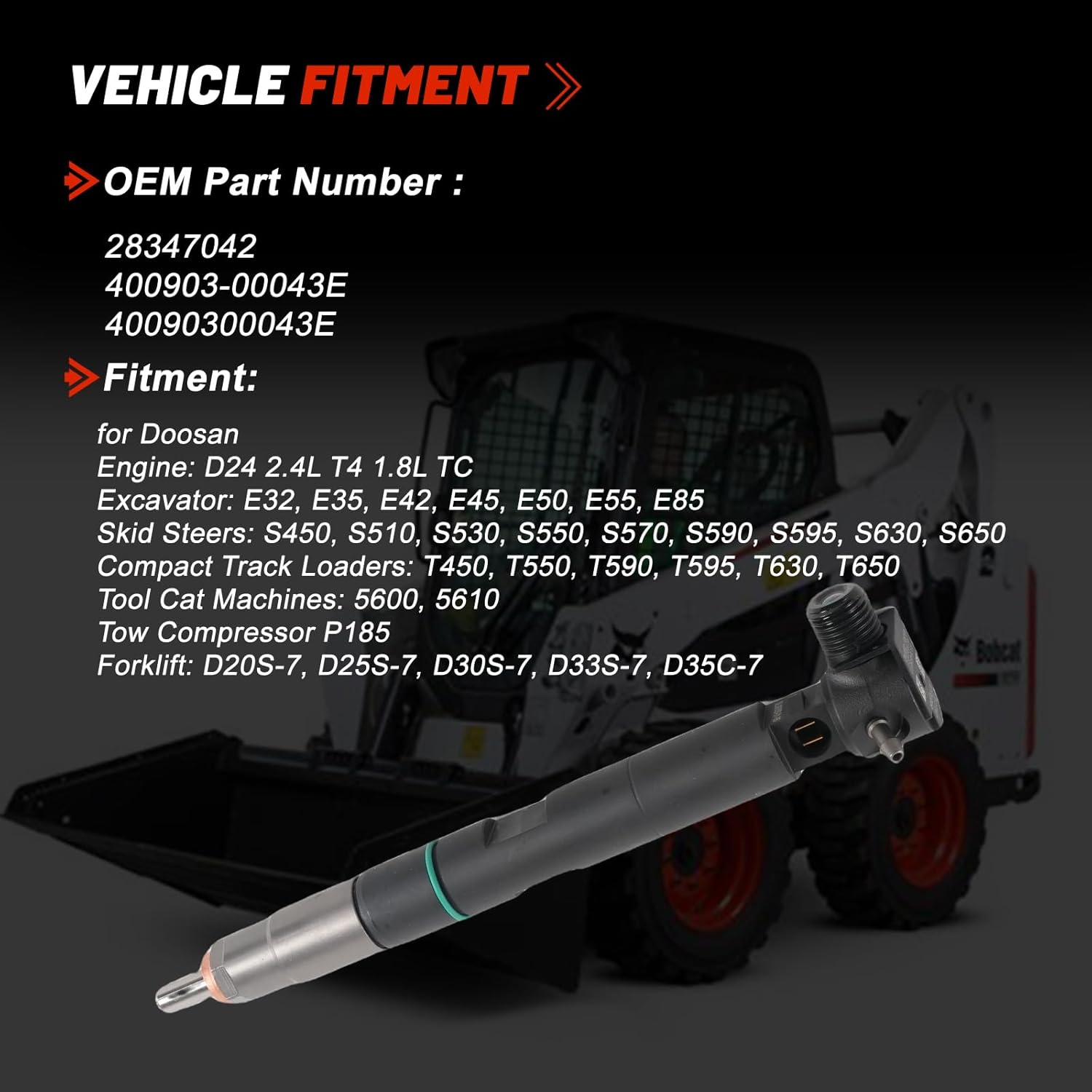 28347042 400903-00043E Fuel Injector for Doosan D34 T3 & T4 3.4L D355 D40 D45 Bobcat A770 T740 T750 T770 T870 S740 S750 S770 S850 V519 V723 Skid Steer Loader▶Product Information:Part Type: Fuel InjectorFuel Type: DieselMaterial: MetalItem Condition: Aftermarket PartWay of Use: Direct ReplacementReference Number: 28347042, 400903-00043E, 40090300043EWarrantyPeriod: 6 months. If there is any problem during this period, repair or replacement service will be provided.★Features and Benefits:All Injectors are completely end of line tested using the exact OE test equipment and specifications.Manufactured with the latest engineering updates so often times it is superior to the dealer channel product.Manufactured using all OE tools and process to provide guaranteed factory performance.Each critical component is re-surfaced or replaced.☎Attention:Reliability - The parts are excellent and fast after-sales service.Parts Updates - According to the original factory specifications manufactured, tested.CustomerFirst – We committed to provid you good buying experience.Terms of Sales - The amount we charged only covers the product, shipping and handling. Any custom or import tax is Buyer's responsibility.