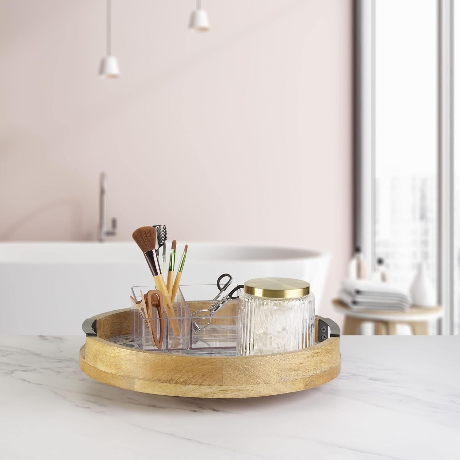 Serve spices or condiments, cheese arrangements, appetizers, and more with this Mikasa Gourmet Basics Addison Lazy Susan. This revolving tray allows everyone at the table to easily reach any item with a simple spin. The elegant wood adorned with an eye-catching pattern brings a touch of style to your home. Features high walls that prevent items from sliding off while rotating. Handcrafted from mango wood with wrought iron handles for long-lasting beauty, even with heavy use. Simply wipe clean with a soft, damp cloth. Tray surface measures 14 inches in diameter, 2.75 inches high.