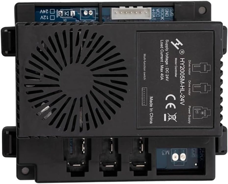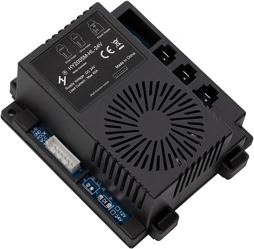 Features:* This product comes with a slow start function, no additional slow starter needs to be installed.* Press and hold the forward and reverse buttons at the same time, the indicator light flashes, then start the vehicle, the indicator light stops flashing, and the connection is successful.* How to tell if the control box is suitable for your vehicle?* Open the damaged electric vehicle and check the control box.* If the control box looks the same, the part should fit your vehicle.* HY2005M-HL-24V children's electric vehicle 2.4G remote control receiver controller.Specifications:Part name: children's electric vehicle receiverModel: HY2005M-HL-24VMaterial: ABSColor: As shown in the pictureSize: Standard sizeType: HY2005M-HL-24V receiverVoltage: 24VControl: 2.4GUse: Vehicles and remote control toysRemote control peripherals: Remote controlFour-wheel drive attributes: AssembledPackage contents:1 x Receiver