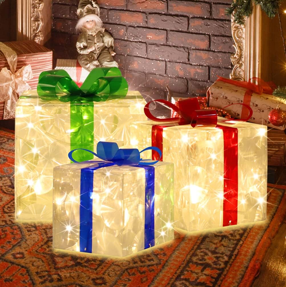 XMASLAND [Large 10"-8.5"-6.5"] 3 Pack 70LED Christmas Lighted Gift Boxes Christmas Decorations for Indoor Outdoor Christmas Tree Skirt Ornament Garden Pathway Holiday Party-Warm White With Flashers Package Includes: 1 x Large box 8.5" x8.5" x10" 1 x Medium box 7" x7" x8.5" 1 x Small box 5.5" x5.5" x6.5" 1 x Instruction 6 x Stakes It is a great way to add a little sparkle to your display.