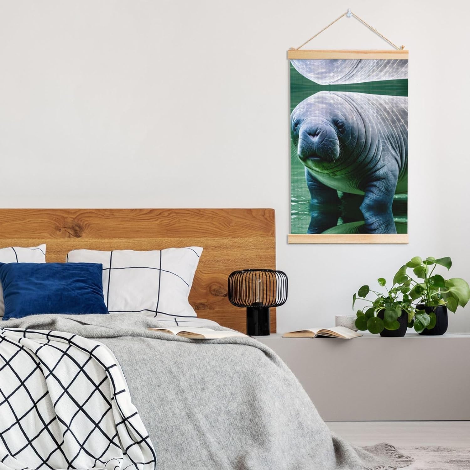 Our Manatee Animals Calf Print Wooden Poster Hanger Is An Excellent Addition To Your Home Decor Or A Perfect Gift For Friends And Family. Made Of Selected Quality Canvas With Brilliant And Enduring Colors, This Wall Art Is Designed To Resist Water, Dust, And Fading, Ensuring The Bright And Vibrant Art Lasts. The Polyester Is Enclosed Between Two Teak Wood Hanger Scrolls With An Attached 35cm Rope For Easy Hanging. Installation Is Made Simple With The Included Two Nails In A Plastic Box. The Modern Minimalist Style Of Our Wall Hanging Complements Any Home Decor, Elevating The Artistic Ambiance And Brightening Up The Room. Experience The Elegant Transformation This Wall Hanging Scroll Painting Brings To Your Spaces Today.
