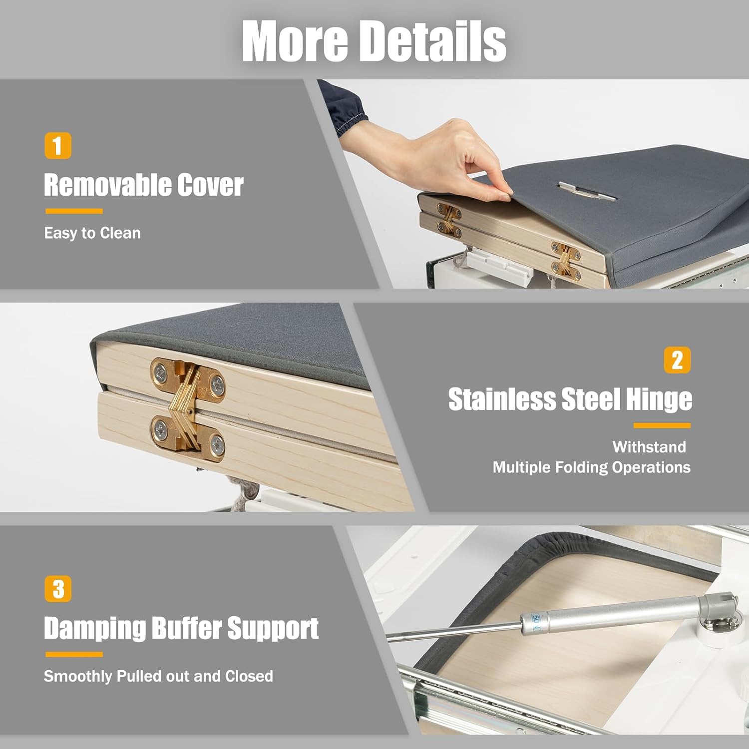 Upgrade Your Ironing Experience, Save Your Precious SpaceTired of bulky, wobbly ironing boards?Our innovative Foldable Ironing Board is the modern, space-saving solution you've been waiting for. Engineered for stability, convenience, and quiet operation, it seamlessly integrates into your home.Perfect for Any HomeIdeal for compact apartments, closets, laundry rooms, and dorm rooms. Its sleek, low-profile design in Gray or Khaki complements any modern decor, turning a chore into a stylish part of your routine.How It Works For You:Pull it out smoothly with one hand.Rotate it 180° to lock into your ideal position.Iron on a rock-steady, large surface.Push it closed quietly and forget it's there.Quality You Can TrustWe use only premium materials—aluminum alloy, MDF, and stainless steel—to ensure a product that withstands daily use and high heat. The machine-washable cover makes maintenance a breeze.