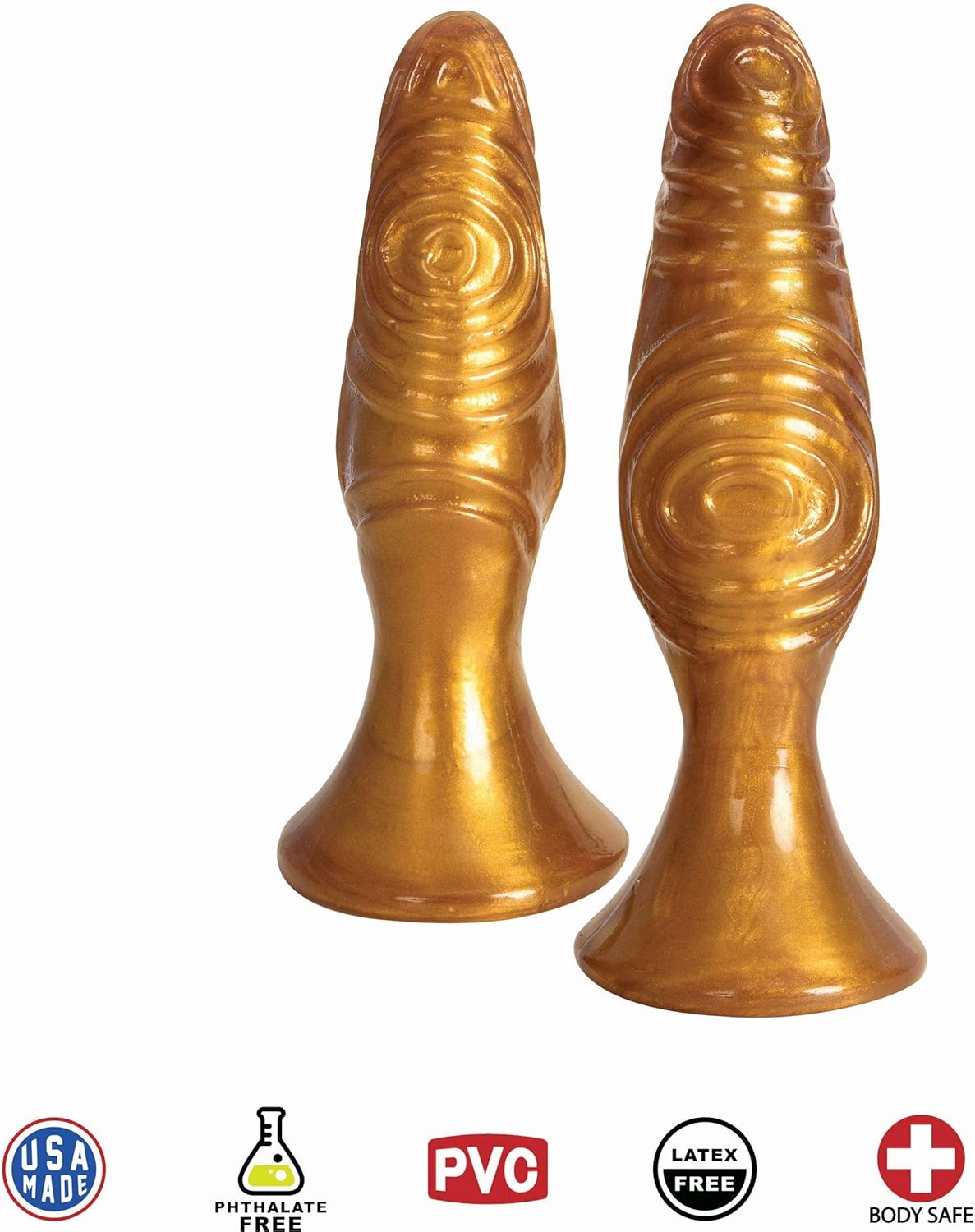 Work your way from small to large with this dastardly duo! These whimsically textured plugs are guaranteed to provide the royal treatment with their bold details! Take your adventures at your own pace when you have two size options to play with. These grooved plugs feature wide, flared suction cup bases that stay firmly in place. Made of enhanced PVC, this plug is durable, pliable, low maintenance, and easy to clean. Use with water-based or silicone lubricant. Curve Toys is known for their ultra-realistic bio-skin formula used to create the best dildos and adult toys in the world. They manufacture their adult replica products in the USA with only body-friendly, phthalate-free, and top-grade materials. Their proprietary blend of bio-skin is mixed in-house, making them a leader in sexual health. All products are inspected for superior functionality so that they represent the value, quality, and innovation from the factory to the bedroom. Staffed by experts with over 60 cumulative years in the adult manufacturing, Curve Toys is the perfect combination of passion, creativity and experience; in short, we know pleasure. Measurements: Small plug is 5.5 inches in total length, 4 inches insertable, and 1.4 inches in diameter. Large plug is 6.25 inches in total length, 4.75 inches insertable, and 1.6 inches in diameter. Material: Phthalate-free PVC. Color: Gold. Note: Made in the USA