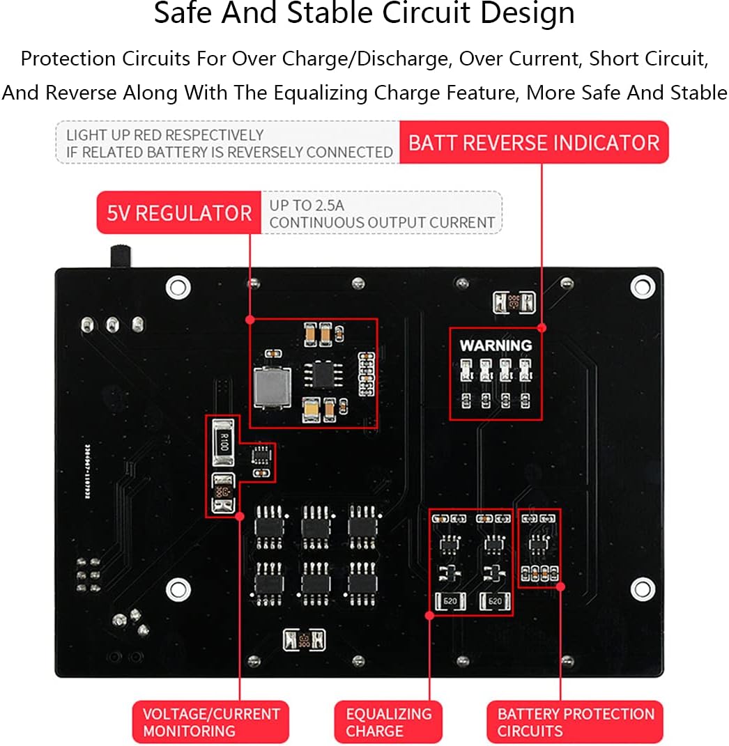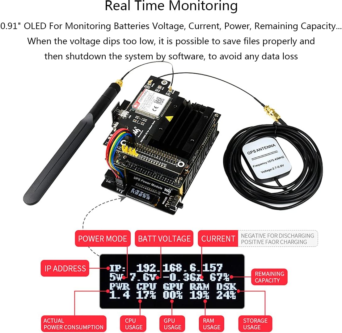Uninterruptible Power Supply UPS Power Module is compatible with Jetson Nano Developer Kit B01. Support Charge and Power Output at the Same Time Stable 5V Power Output Real Time OLED Monitor Safe and Stable Circuit Design Power Jetson Nano seamlessly from power connection OR the backup batteries. Features 1. Compatible with Jetson Nano Developer Kit B01,Mounting holes are compatible with Jetson Nano Developer Kit. Communicating via I2C bus through 6PIN cable, no other IO pin required 2. I2C bus communication, monitoring the batteries voltage, current, power, and remaining capacity in real time 3. 0.91" OLED for displaying info like batteries voltage, IP address, RAM usage, etc. 4. Multi battery protection circuits: over charge/discharge protection, over current protection, short circuit protection, and reverse protection, along with the equalizing charge feature, more safe and stable 5. Onboard 5V regulator, up to 2.5A continuous output current 6. Batteries warning indicators, easy to check if the battery is connected correctly It is able to charge the batteries and provide power output at the same time from external power supply Automatically switch over to batteries output if external power supply is unavailable, keeps the system running without any trouble Specifications Output Voltage: 5V Charger: 8.4V 2A Control bus: I2C Supported battery: 18650 Li battery (NOT included) Battery capacity: 4x batteries 10400mAh Dimension: 113mm × 79mm Mounting hole: 2.5mm Note: The 18650 batteries are NOT included Comes with Online Development Resources and Manual,Please send us Amazon message to get it if necessary.